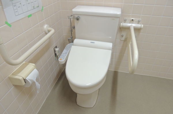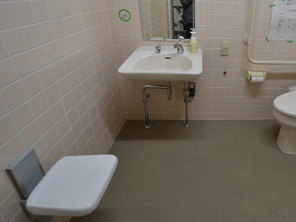写真は屋内1階トイレ。3階トイレへはエレベータあり。